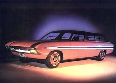 First up is the 1964 Aurora concept wagon. It had lots of features including maybe the first "aerodynamic" headlights. Instead of 2 or 4 round lights, it used electroluminescent strips at the front and the sides. It featured lounge seating. It featured a steering yoke, not a wheel. It featured a large sunroof with adjustable polarization. It even had what could be argued to be the first dash mounted nav system.